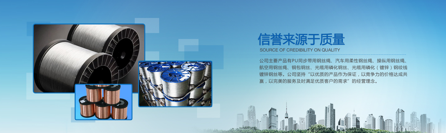 公司主要產(chǎn)品有PU同步帶用鋼絲繩、汽車用柔性鋼絲繩、操縱用鋼絲繩、航空用鋼絲繩、銅包鋼絲、光纜用磷化鋼絲、光纜用磷化(鍍鋅)鋼絞線、鍍鋅鋼絲等。經(jīng)過多年的研究、摸索、開發(fā),公司已形成了完整的技術、工藝軟件,產(chǎn)品實物質量均達到國際先進水平。